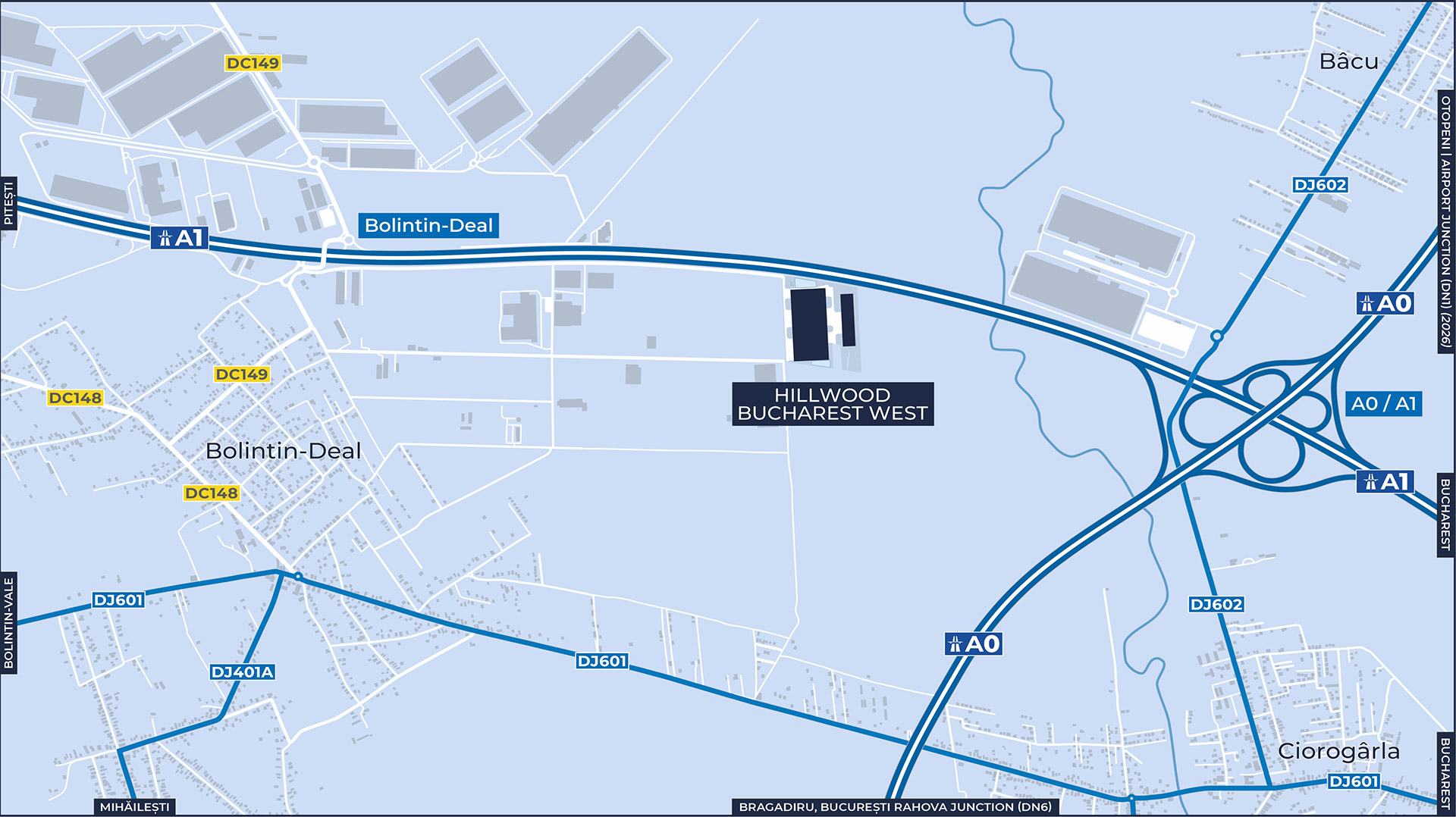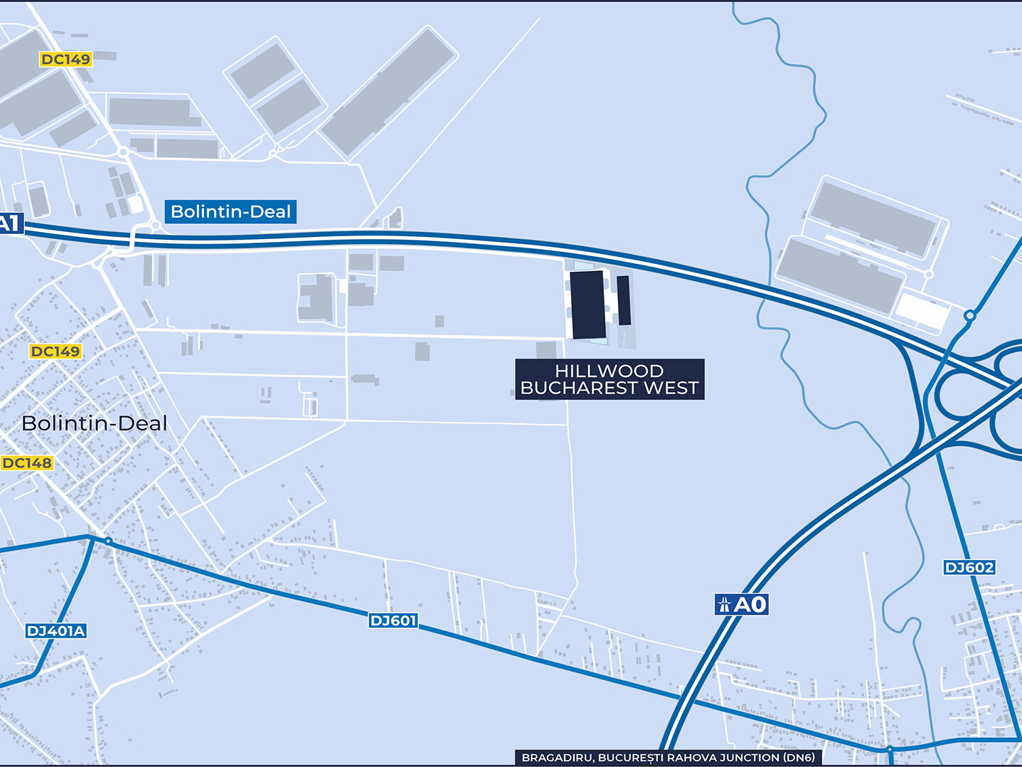 Hillwood Bucharest West is strategically located near Ciorogârla, Romania, directly connecting to the A1 motorway, just minutes from the A0 ring road.
